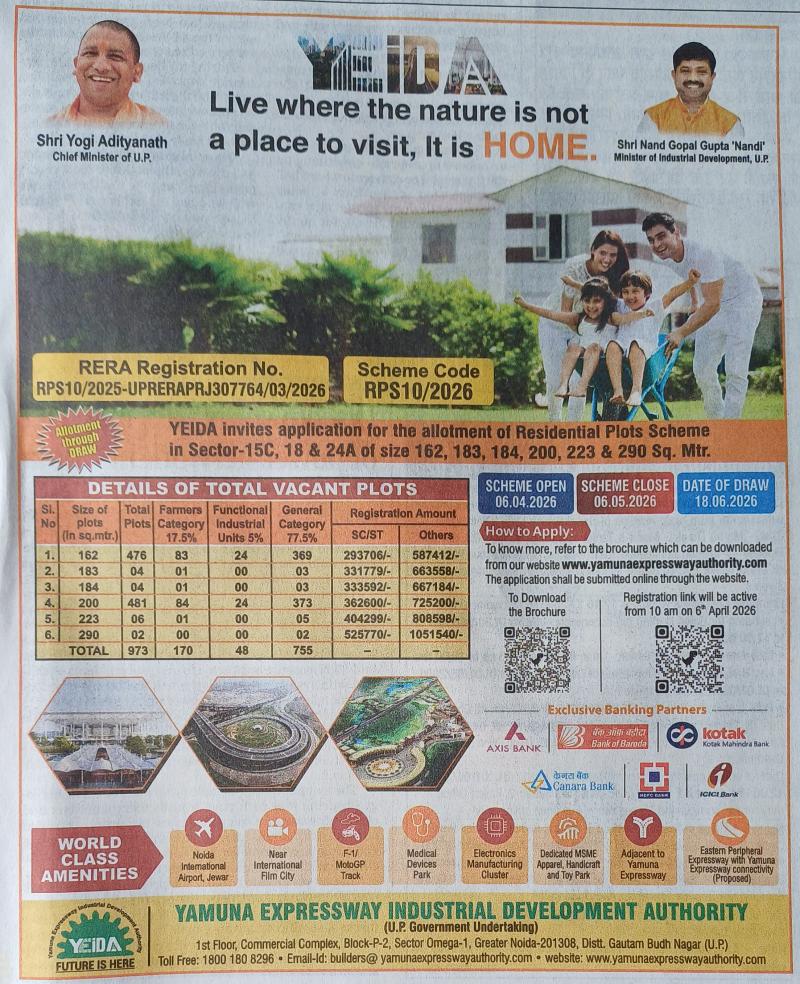 YEIDA has launched a new residential Plots Scheme on 6th April 2026. The details for this scheme is as below: